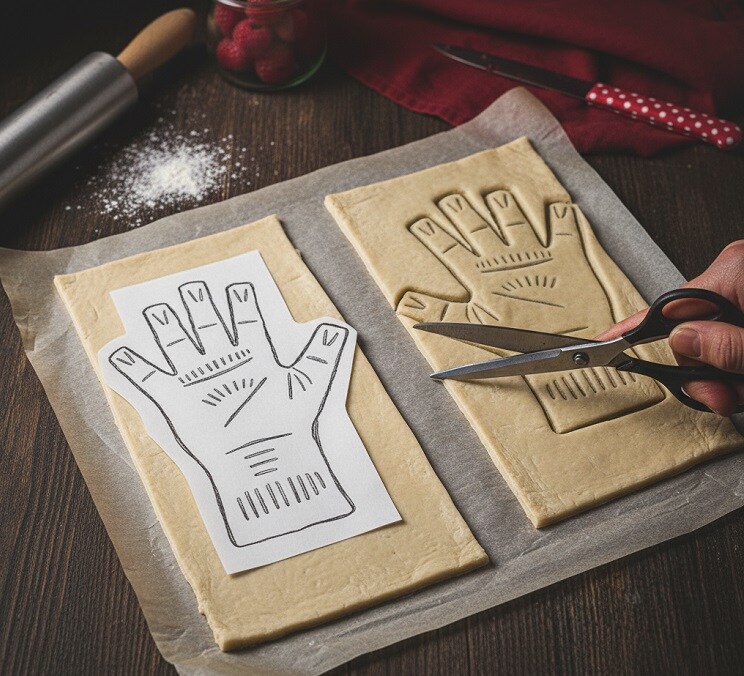 Verwarm de oven voor op 215∘C. Teken de omtrek van je hand (of gebruik een plastic handschoen) op een vel papier en knip het uit om een sjabloon te maken. Rol het bladerdeeg uit op zijn bakpapier. Leg het sjabloon op het bladerdeeg en snijd met een scherp mes twee identieke handvormige silhouetten uit. Verwijder het overtollige deeg.