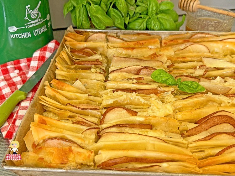 Het is een soort HARTIGE TAART met een basis van filodeeg, goudbruin en knapperig, gevuld met schijfjes peer en Gorgonzola kaas (of Brie, afhankelijk van je voorkeur) verrijkt na het bakken met een subtiel drupje honing. Ik verzeker je dat het licht pittige contrast van de kaas met de zuurheid van de peer en de zoetheid van de honing zich niet beter kan “verzoenen”!