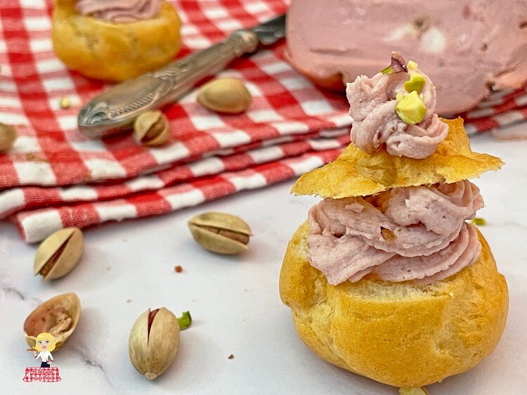 In het recept van vandaag heb ik gekozen voor een mortadellamousse verrijkt met pistachenoten, zonder koken en klaar in slechts 5 minuten, maar je kunt het gerust vervangen door ham-paté of gewoon een ricottamousse, gemengd met geraspte Parmezaan, zout, peper en geroosterde amandelsnippers, klaar in minder dan een minuut.