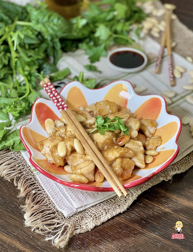 De originele Chinese versie vereist naast KIP, AMANDELEN en SOJASAUS ook andere ingrediënten zoals bamboe en rijstwijn en een lange marinade van de kip, maar aangezien deze ingrediënten niet gemakkelijk te vinden zijn en ik altijd weinig tijd heb, heb ik gekozen voor dit snellere KIP-met-AMANDELEN recept dat daardoor niet minder lekker is.