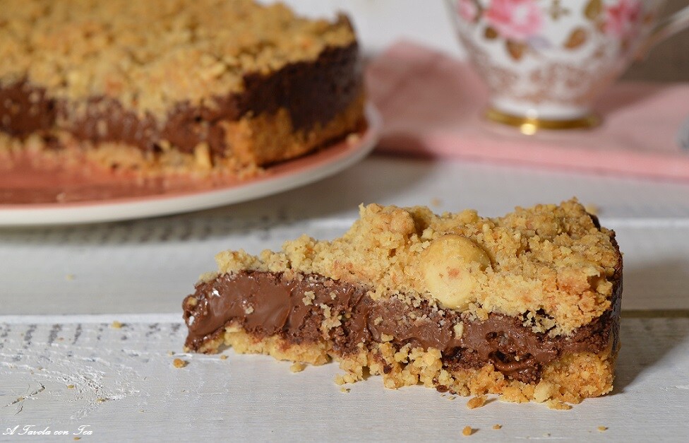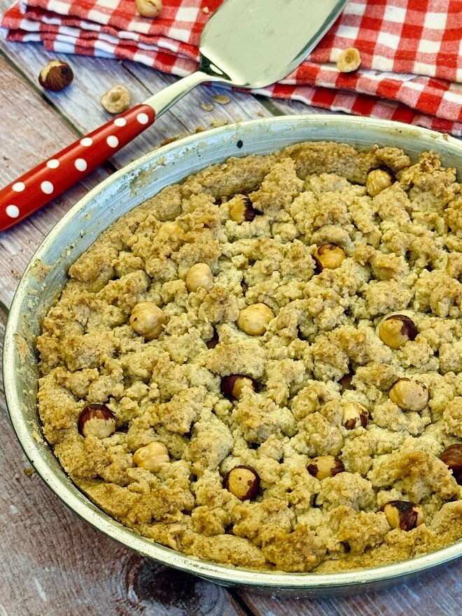 Ik zweer dat meneer Ferrero me niet heeft betaald om deze dingen te zeggen!!!! Mijn zoetekauw was groot, maar mijn zin om te zweten iets minder, dus maakte ik een kruimeltaart – niets nieuws, zou je terecht zeggen – waaraan ik echter een toevoeging deed, namelijk geweldige Piemontese hazelnoten in het deeg.