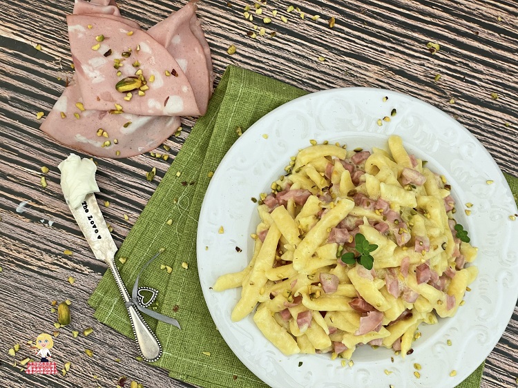 Mortadella en pistachenoten zijn twee ingrediënten die perfect samengaan en met toevoeging van smeerkaas een romig en omhullend sausje creëren zonder het gerecht te zwaar te maken.