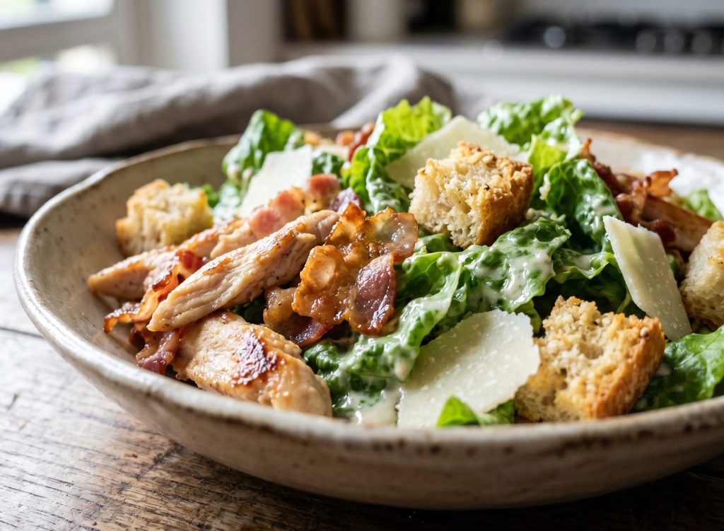 Het geheim om te voorkomen dat de salade “slap” wordt, is de temperatuur van de ingrediënten. Zorg dat de kip en de pancetta lauw of op kamertemperatuur zijn voordat je ze bij de koude sla uit de koelkast voegt. Deze gecontroleerde temperatuurschok houdt de bladeren stevig en de dressing romig.