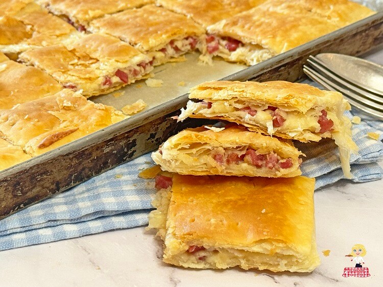 Heel eenvoudig en heerlijk, deze rustieke taart met salami en kaas, een hartige taart van bladerdeeg gevuld met provolone en Napolitaanse salami, perfect voor een aperitief of als voorgerecht geserveerd in kleine blokjes.