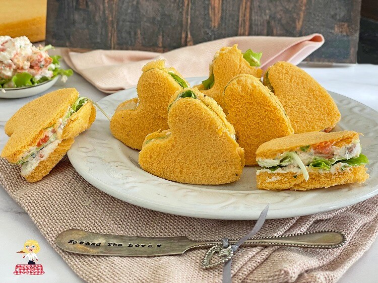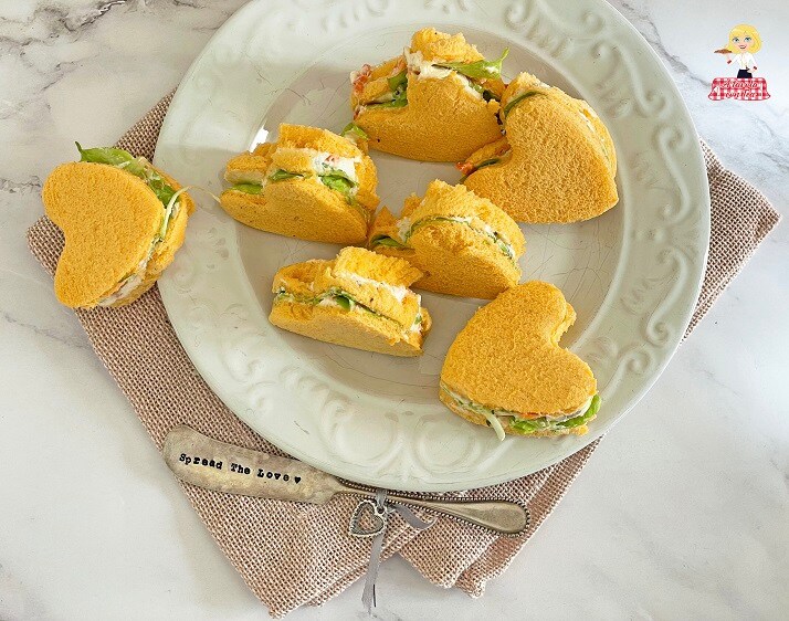 • Leg het sandwichbrood op een snijplank of werkoppervlak, verdeel er twee royale lepels vulling over en smeer het uit met een spatel, voeg enkele blaadjes sla toe. Leg vervolgens de sneetjes brood op elkaar. Maak harten met behulp van een koekjesuitsteker of een vormpje. Leg ze op een serveerschaal en Fijne Valentijnsdag!