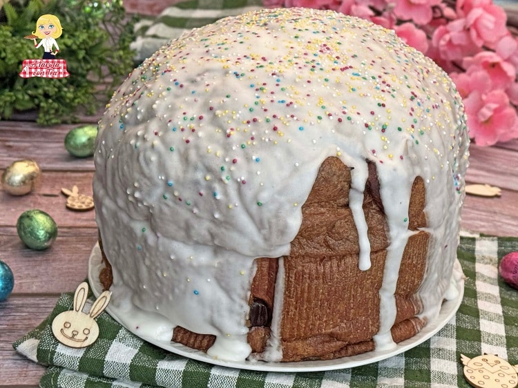 • Wanneer de cake klaar is, haal hem uit de oven, laat hem afkoelen voordat je hem uit de vorm haalt. Plaats het dan op een rooster en giet met behulp van een lepel het net bereide suikerglazuur erover. Decoreer met gekleurde snoepjes. Laat het glazuur drogen voordat je het serveert. Vrolijk Pasen!