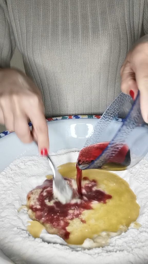 Maak een kuiltje in het midden van de bloem en voeg vervolgens onze vloeistoffen toe. Het water, de olie en de rode wijn.
