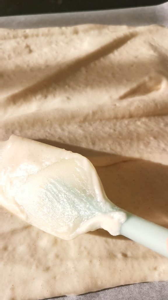 Meng zonder het mengsel af te breken en verspreid het vervolgens over een bakplaat bekleed met composteerbaar bakpapier.
