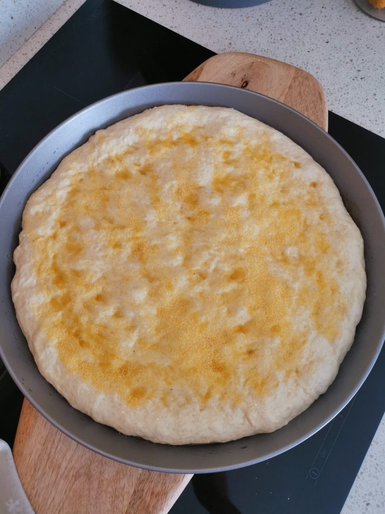 Als je wilt, bestrooi de bovenkant met wat maïsmeel of polenta, dat draagt bij aan de vorming van een knapperiger korst.