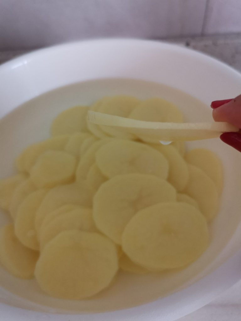 Leg de plakjes in een kom met koud water en laat ze 15-20 minuten weken.