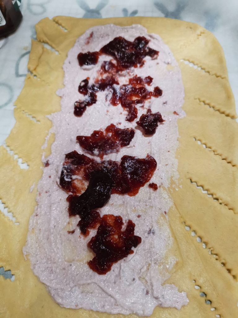De basisvulling kan enkel jam zijn, of zoals ik het heb gedaan, een laag ricotta en jam en ten slotte stukjes verse ananas.