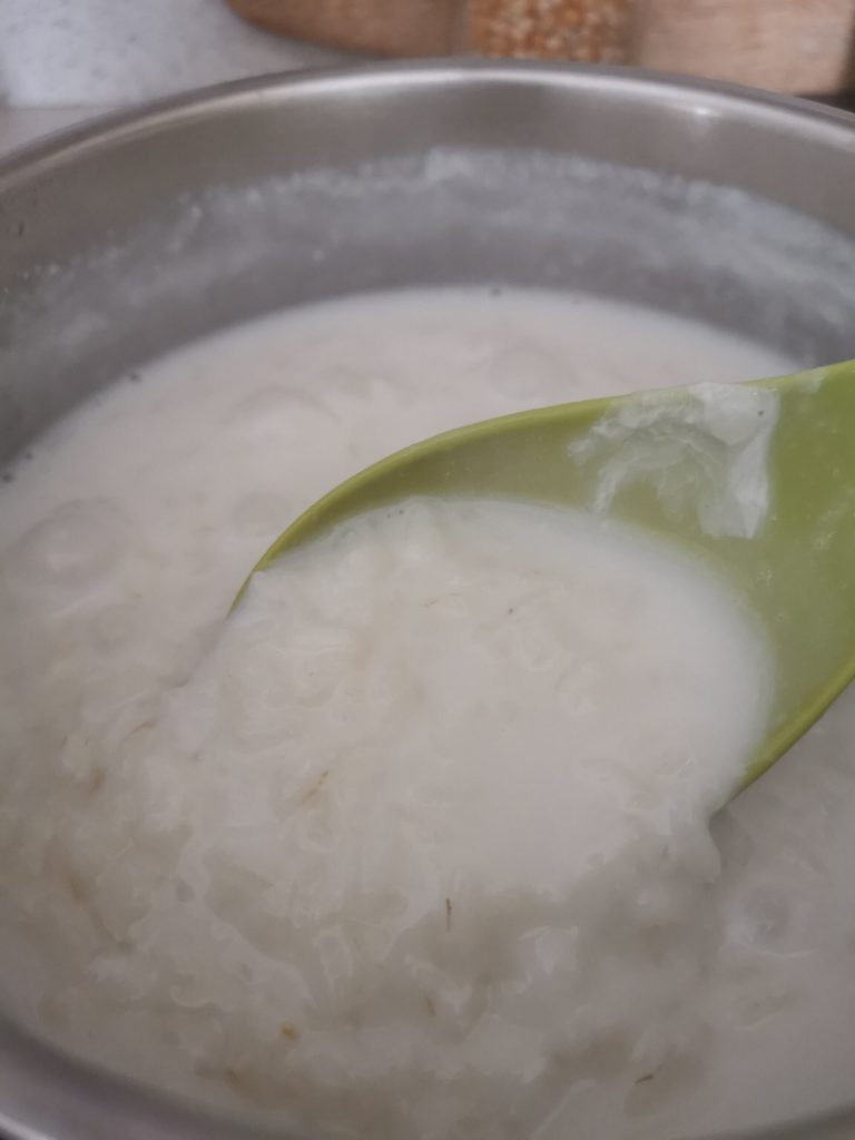Neem een pan en giet er water, melk en zout in. Breng aan de kook en voeg de rijst toe. Laat koken tot de rijst een geheel wordt met de vloeistoffen. Het moet een crème worden.