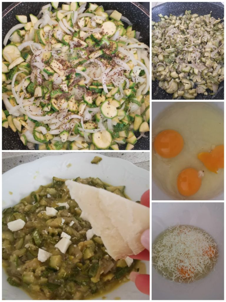 Voeg de gekookte courgettes toe en meng goed. Voeg tenslotte de blokjes pecorino toe, die de frittata nog smaakvoller en smeuïger maakt.