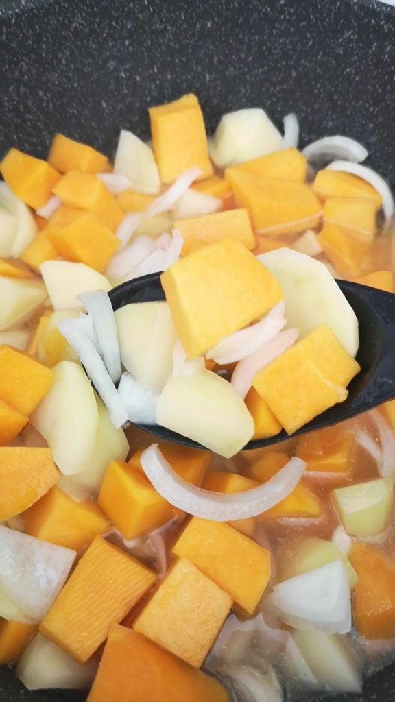 Neem de pompoen, de aardappelen, de uien, de knoflook en de selderij en snijd alles in blokjes.