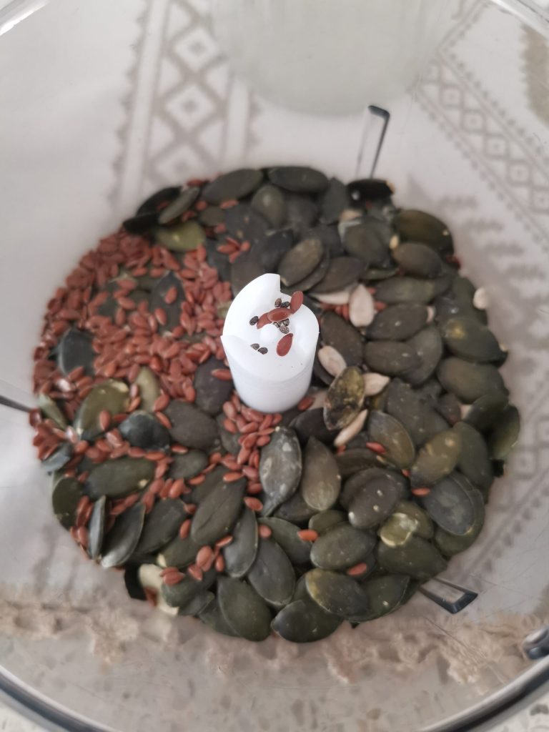We bereiden het zadenmeel voor door 130 g gemengde zaden te malen. Ik gebruikte voornamelijk pompoenpitten, daarna zonnebloempitten, lijnzaad, chia en slechts 7/8 amandelen.