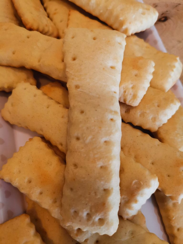 Eenmaal uitgerold, snijd met een wieltje rechthoeken van ongeveer 7/8 cm lang. Ik heb ook kleine gaatjes in het oppervlak gemaakt, met de achterkant van een houten stokje voor spiesjes.