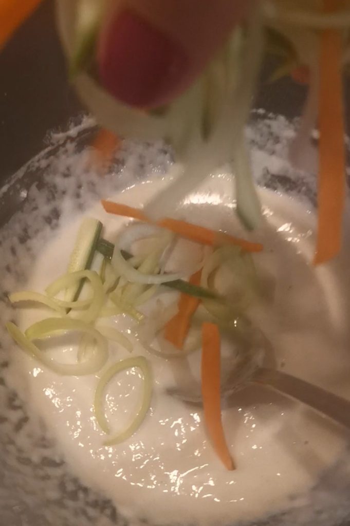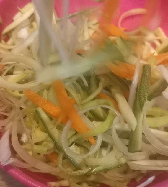 Voeg nu de gesneden groentjes toe aan het beslag.