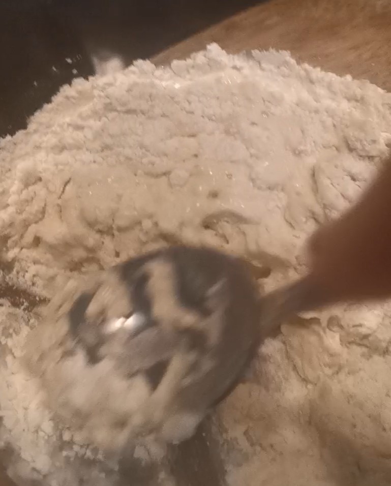 Ik begon met het bereiden van het beslag, ik deed koud water en zout en voegde beetje bij beetje bloem toe, het moet een beslag worden dat niet te vloeibaar en niet te dik is.