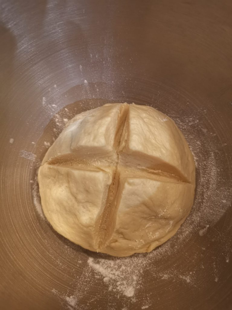 Voeg dit mengsel toe aan de meelsoorten en meng tot een deeg.Maak met een mes een soort kruis op het deeg. Laat het dan rijzen in een afgedekte kom op een tochtvrije plaats voor minstens 3 uur. Het deeg moet goed gerezen zijn.