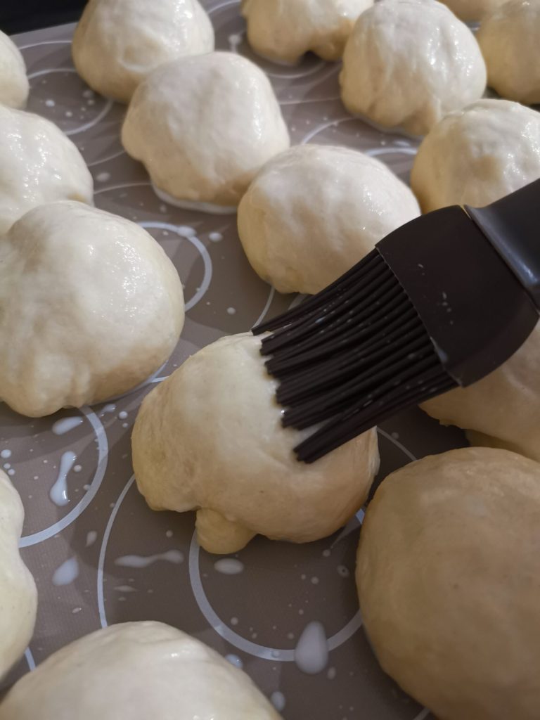 Na deze tijd zijn de broodjes mooi opgezwollen en gaan we het oppervlak bestrijken met de melk voordat we ze in de oven doen. Zet de oven op 180 graden statisch en bak ze voor ongeveer 20/25 minuten. Pas aan op basis van je oven. Doe de stokjestest en als ze klaar zijn, zet de oven uit en haal de broodjes eruit.