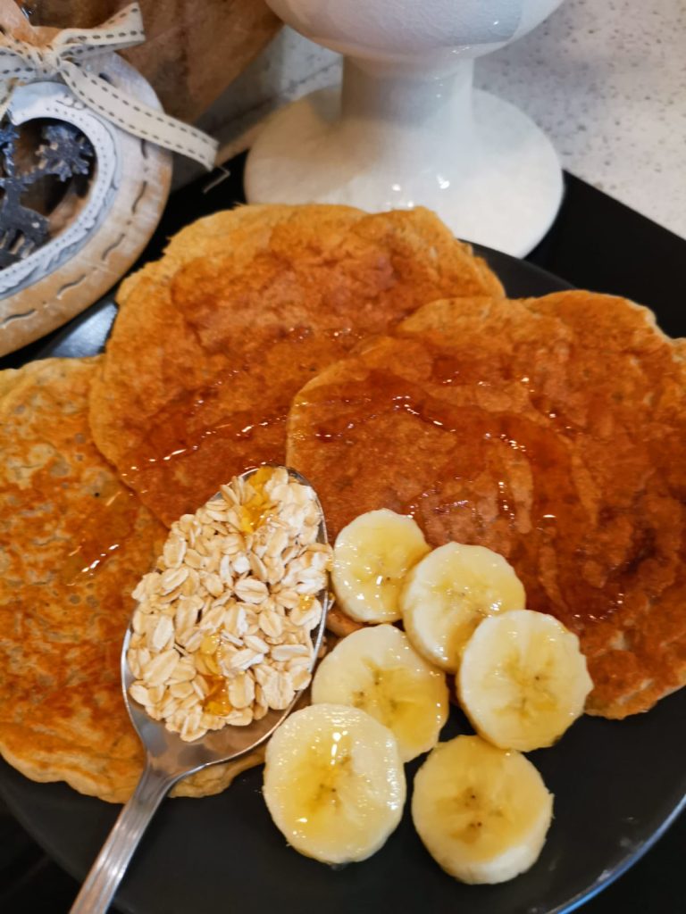 • Leg ze na het bakken op elkaar op een bord en serveer direct met verse banaan, havervlokken, honing, ahornsiroop of Griekse yoghurt.