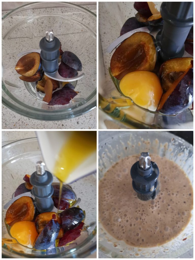In de kom van een keukenrobot doen we de gewassen, gehalveerde en ontpitte pruimen.