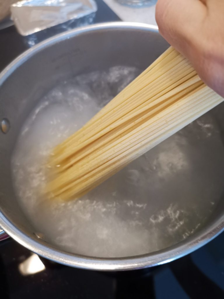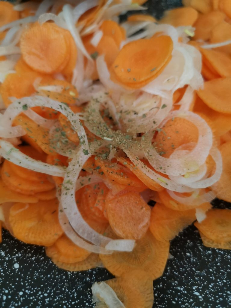 Het eerste wat je moet doen, is de wortelen, knoflook en ui schoonmaken. Snijd alles fijn en doe het in de pan. Ik gebruik altijd de “salta pasta” pan zodat ik, eenmaal de spaghetti gekookt, de pasta direct kan toevoegen om alles te mengen.