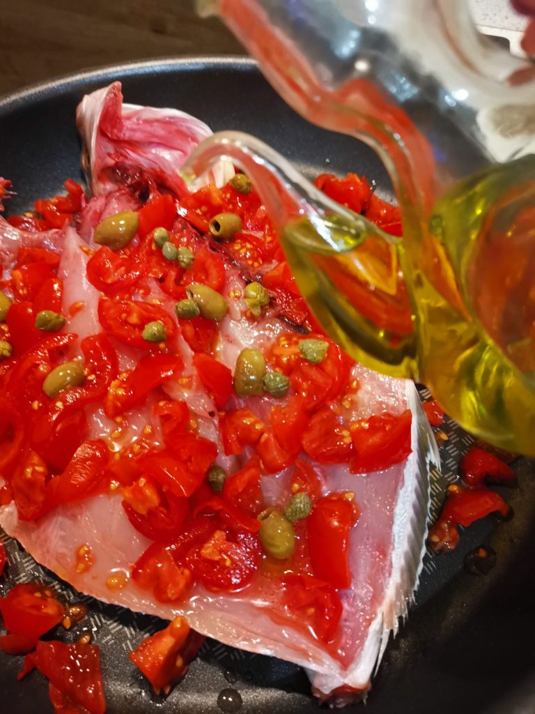 Zou een Liguriër, met Sardijnse roots, de zee en al haar bewoners niet kunnen liefhebben??? Neeee, absoluut niet. Ik hou van de zee, ik hou ervan om daar te zijn en ik hou ervan om te genieten van haar vruchten. Ik ben dol op schaaldieren, schelpen en koppotigen (octopussen, sepia’s, calamares, om precies te zijn). Vandaag vertel ik je het eenvoudige maar oh zo smakelijke en appetijtelijke recept van amberjack. Ik heb ervoor gekozen om het te bereiden met Piccadilly tomaatjes, Taggiasca-olijven en kappertjes, omdat hun smaak en aroma de meeste gerechten op onze tafel lekkerder maken. Dus, ben je klaar om het met me te koken? Ik heb je niet gehoord? Jaaaa, kom mee…