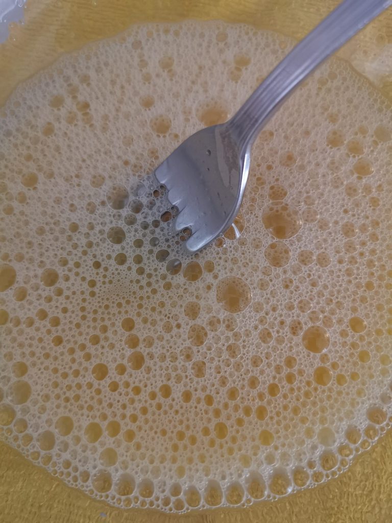 Giet het water in een mengkom, voeg de suiker toe en begin te roeren met een vork.