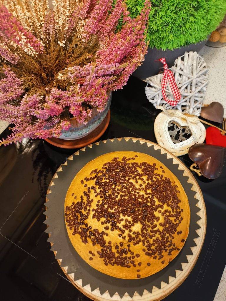 Neem nu de bakvorm, vet hem in en bestrooi met bloem. Ik heb een vorm gebruikt van 22 cm diameter. Verdeel het beslag erin en decoreer met chocoladedruppels.