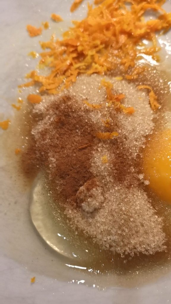 Breek het ei in een kom en voeg de suiker, het snufje zout, de amandelextract, de kaneel en de geraspte schil van een eetbare sinaasappel toe.