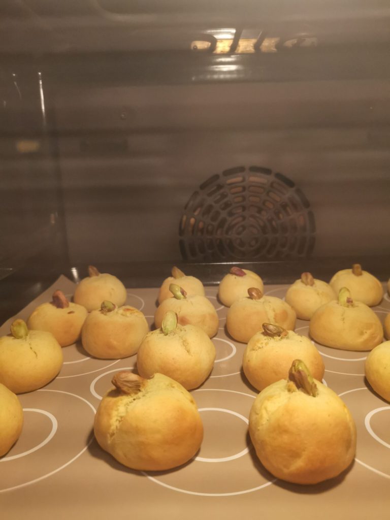De zachte koekjes met yoghurt, sinaasappel en specerijen zijn ronde zoetigheden met een pistache in het midden, die je ook kunt vervangen door hazelnoten of amandelen.