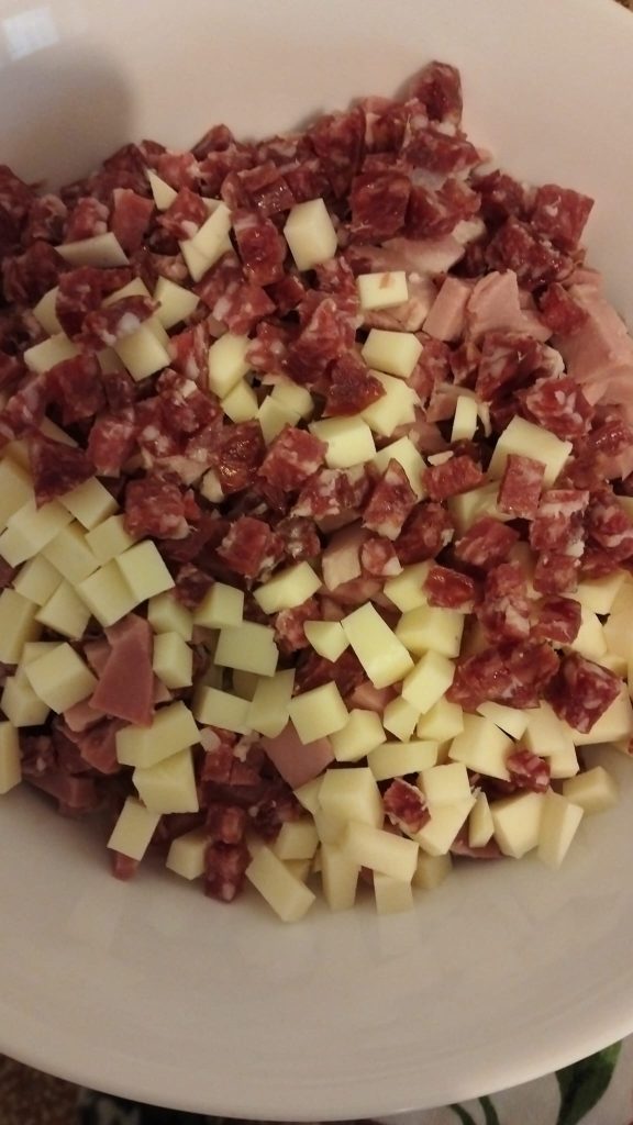 Bereid ondertussen de vulling voor door vleeswaren en kazen in blokjes te snijden.