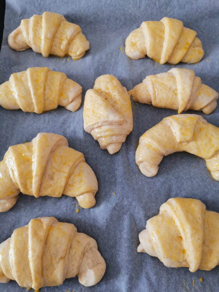 Na het vormen, plaats je de croissants op bakplaten bekleed met bakpapier en laat je ze nog ongeveer anderhalf uur rijzen.