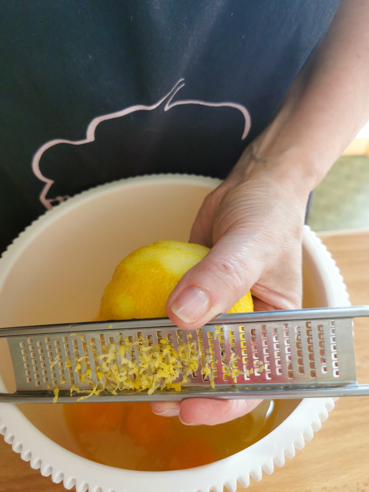 Doe de eieren op kamertemperatuur in een kom met de zoetstof, een snufje zout en de geraspte schil van een onbehandelde citroen.