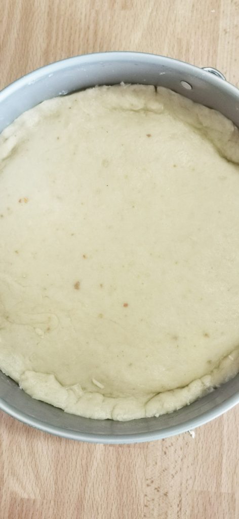 Maak de eerste schijf en leg deze in de ingevette en met bloem bestoven vorm van 22 cm, probeer ervoor te zorgen dat het zanddeeg mooi hoog blijft aan de randen van de vorm. Giet op dit punt de ricottacrème erin en strijk deze goed glad.