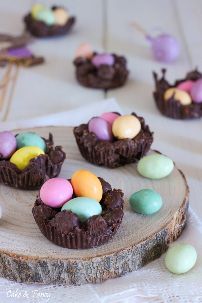 wacht een paar minuten en plaats de gekleurde paaseitjes in het midden, laat de chocolade nestjes drogen. Ongeveer 2-3 uur, maar als je de rusttijd wilt verkorten, zet ze dan 30-40 minuten in de koelkast, haal ze pas uit de bakvormpjes als ze volledig droog zijn… En geniet van een heerlijke traktatie!