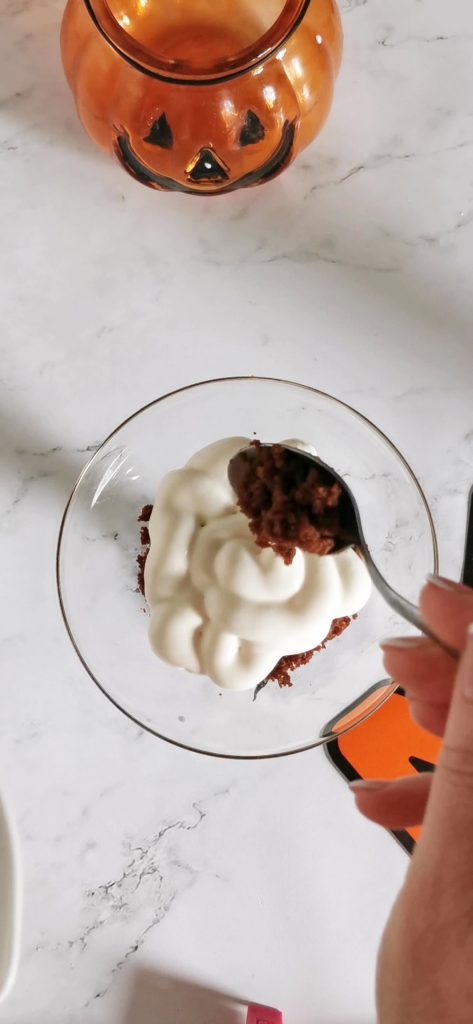 De Halloween dessert bewaar je in de koelkast, maar voor het serveren adviseer ik je om het minstens 15 minuten op kamertemperatuur te laten staan, je zult de romigheid voelen!
