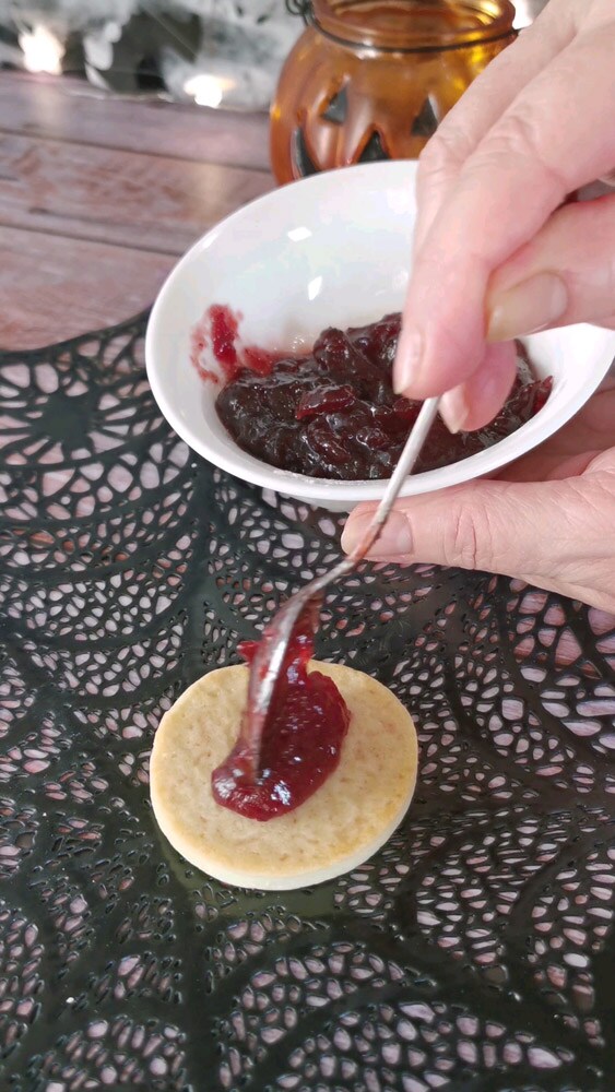 Als de glazuur klaar is, glazuren we alleen de koekjes met ogen en neus en laten ze drogen.We nemen het ongemarineerde koekje en smeren de jam erop, daarna leggen we het geglazuurde koekje erop, nu hoeven we alleen nog maar de mond te creëren. We smelten de pure chocolade, plaatsen deze in een spuitzak en voilà, laten de chocolade een paar minuten drogen, nu is onze Jack Skellington klaar om Halloween te vieren.