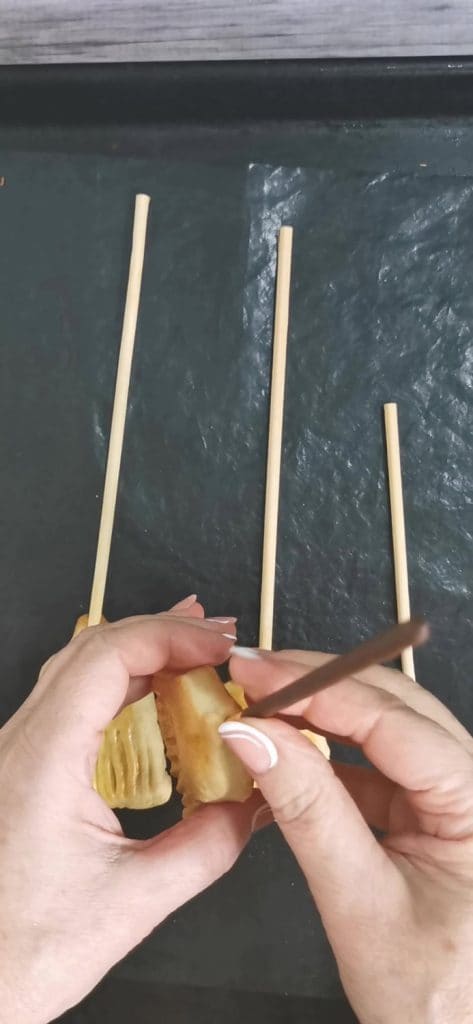 Steek onmiddellijk in het gaatje waar de spies werd verwijderd, het mikado-koekje in aan het uiteinde zonder chocolade. Laat vervolgens de bezems afkoelen en stabiliseren op een koelrek. Smelt ondertussen de pure chocolade en decoreer de bezems zoals je wilt met een spuitzak, of gewoon met een spiesje.
