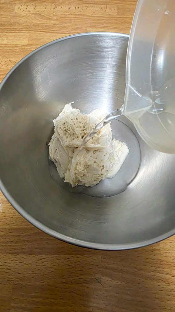 Op dit punt halen we ons zuurdesem eruit en nemen we 200 g. van het deeg, verwijderen we het bovenste deel, dat minder actief is, en proberen we de kern van het deeg te nemen, de rest zal helaas weggegooid moeten worden. Doe het in een kom en voeg 100 ml water toe, los het deeg op en voeg 200 g bloem toe. Kneed en doe het deeg weer in de pot, dek af en laat weer 48 uur rusten. Je zult langzaam zien dat het mengsel de eerste belletjes maakt, kleine gaatjes creëert en een licht zure geur afgeeft: dit is het teken dat het groeit.