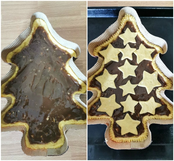 Leg de sterretjes op de crème, zet in een voorverwarmde oven en laat bakken op 180° gedurende 35-40 minuten, afhankelijk van uw oven. Haal de taart na het bakken uit de oven en laat afkoelen, serveer de taart met een beetje poedersuiker en geniet ervan!