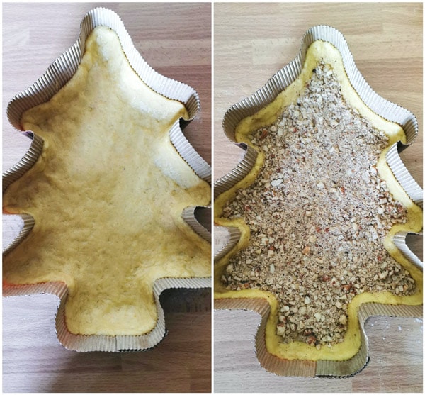 Haal het zanddeeg uit de koelkast en rol het uit tot een dikte van 4/5 mm. Bekleed de kerstboomvorm zonder deze in te vetten of te bebloemen, en prik met een vork enkele gaatjes in de bodem.