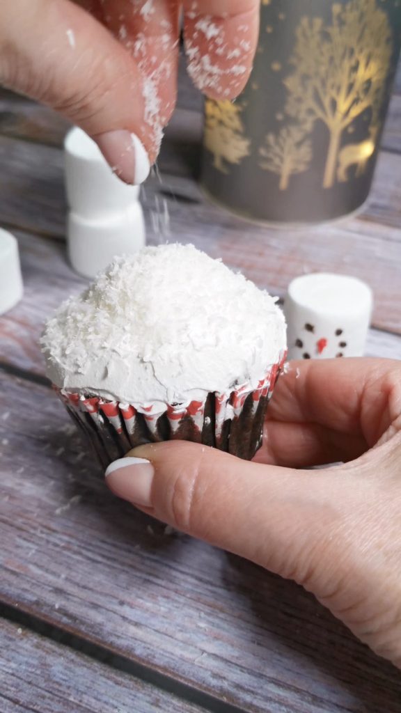 • Met de spuitzak maak je het lichaam van de sneeuwpop, misschien kun je helpen met een klein spatel om het beter te modelleren. Zodra het klaar is, strooi je de geraspte kokos erop om het sneeuweffect te creëren. Daarna neem je de marshmallows en met de gesmolten chocolade maak je de ogen en de mond, tenslotte met een beetje voedingskleurstof in gel vorm je de neus, laat het drogen en plaats dan voorzichtig de marshmallow bovenop de room.