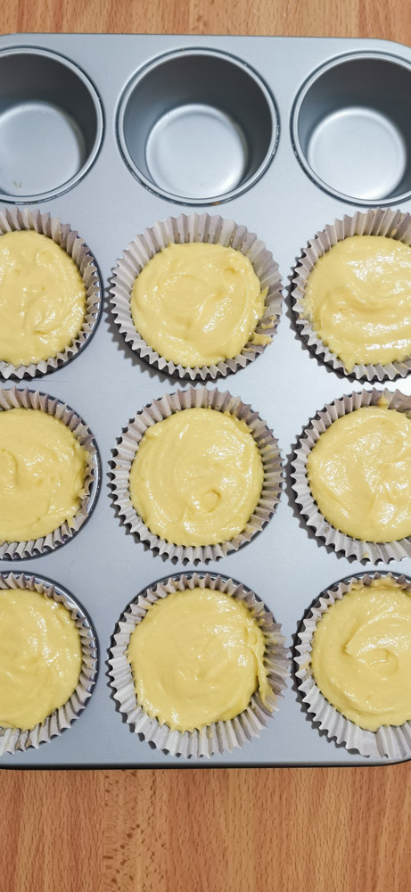 • Plaats nu de papieren cakevormpjes in de muffinbakvorm en giet het mengsel erin. Als je geen papieren cakevormpjes wilt gebruiken, moet je de bakvorm altijd invetten. Het beslag moet voor ongeveer 3/4 in elk vormpje zitten. Bak in een voorverwarmde oven op 180°C voor ongeveer 20/25 minuten, maar de tijd is altijd indicatief, afhankelijk van je eigen oven.