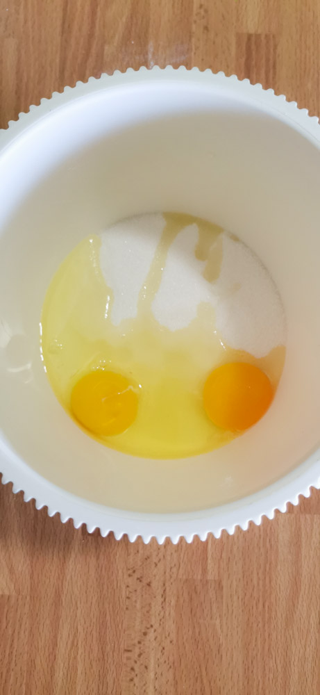 • Klop de eieren met de suiker tot ze schuimig en luchtig zijn. Zodra ze klaar zijn, voeg je de zachte boter en de mascarpone toe. Meng het geheel met een handgarde tot het een zachte crème wordt. Voeg het snufje zout en de gezeefde bloem toe en meng het beslag zonder klontjes te vormen.