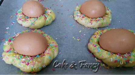 • Leg het hardgekookte ei in het midden en laat het een half uur rusten. Na deze tijd, klop het ei lichtjes in een kom en bestrijk de krans. Versier ten slotte met de gekleurde hagelslag.