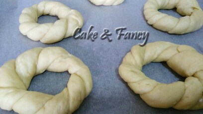 • Druk de uiteinden goed aan, zorg ervoor dat je de verbinding naar beneden verstopt. Leg de kransjes op een bakplaat bekleed met bakpapier, goed uit elkaar.