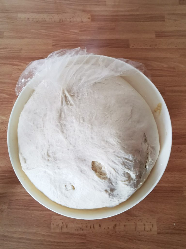Wanneer het deeg de juiste binding heeft bereikt, haal het dan uit de keukenmachine; leg het in een ruime kom en dek het af met plasticfolie, leg er daarna een theedoek overheen. Laat het nu rijzen op een warme plek, het is ook goed in de oven met alleen het licht aan. Laat het de hele nacht staan, ongeveer 12/13 uur, het moet drie keer in volume toenemen.