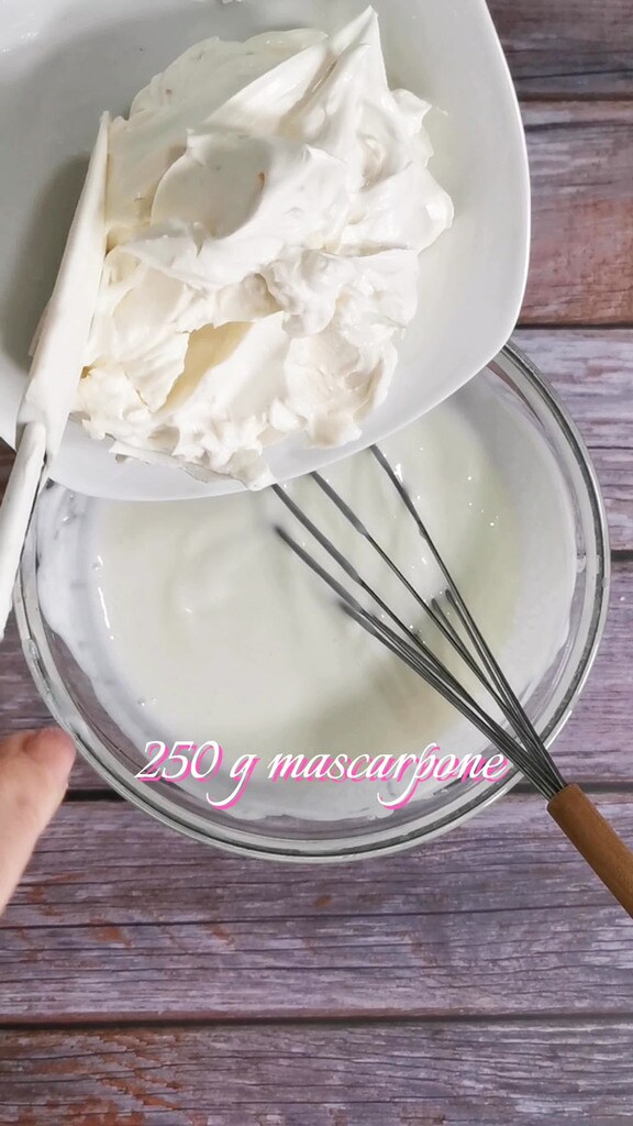 Vervolgens nemen we de mascarpone en voegen deze toe aan de yoghurt, we maken een gladde, fluweelzachte crème, nu voegen we het mengsel van aardbeien en gelatine toe. We nemen de vorm met de basis uit de koelkast en gieten de zachte crème eroverheen. We zetten het weer in de koelkast om het minstens 5 uur, nog beter een hele nacht, te laten opstijven.